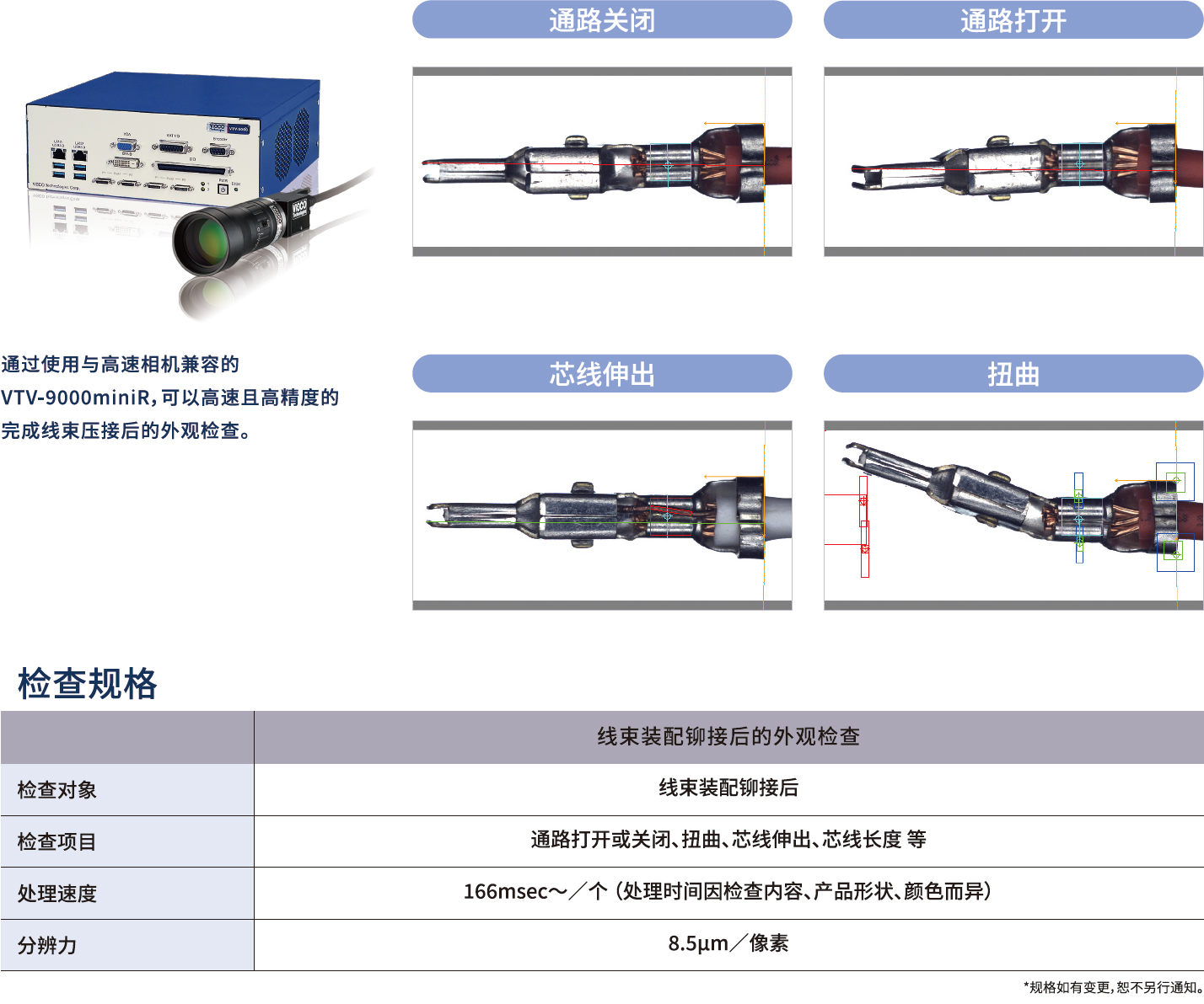 線束裝配鉚接后的外觀檢查 400個/分鐘高效率的高速外觀檢查! 線束裝配鉚接后的通路打開或關閉,扭曲,芯線伸出,芯線長度等檢查。