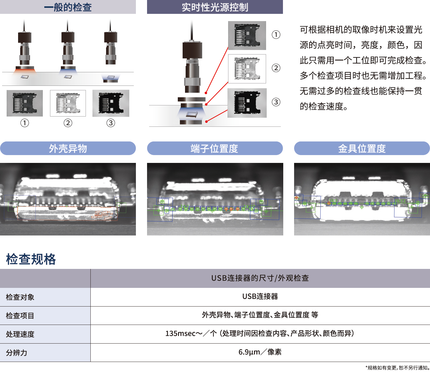 The size/appearance inspection of USB connector uses one station to realize complex inspection! Inspection of USB connector. Check the enclosure for foreign matters, terminal position and hardware position. Switch the appropriate light source according to the inspection items, and check with the best image.