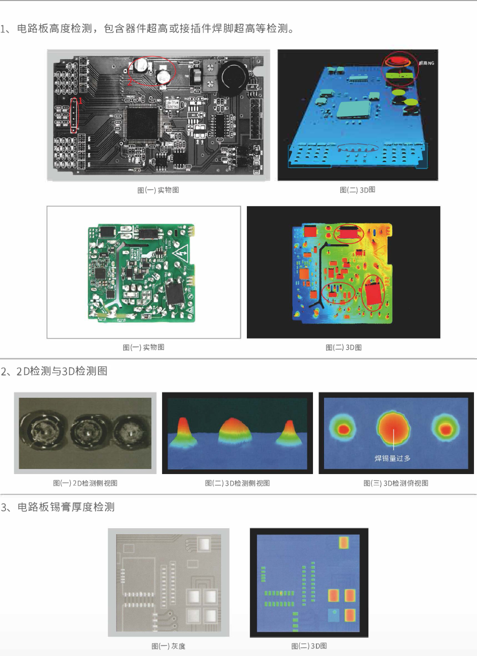 Detection advantages Ultra wide X range: for common circuit boards, it is unnecessary to scan multiple times for high dynamic range: it can simultaneously detect the height of various materials, fast full inspection: a single scan can simultaneously detect height anomalies. Abnormal soldering and device.