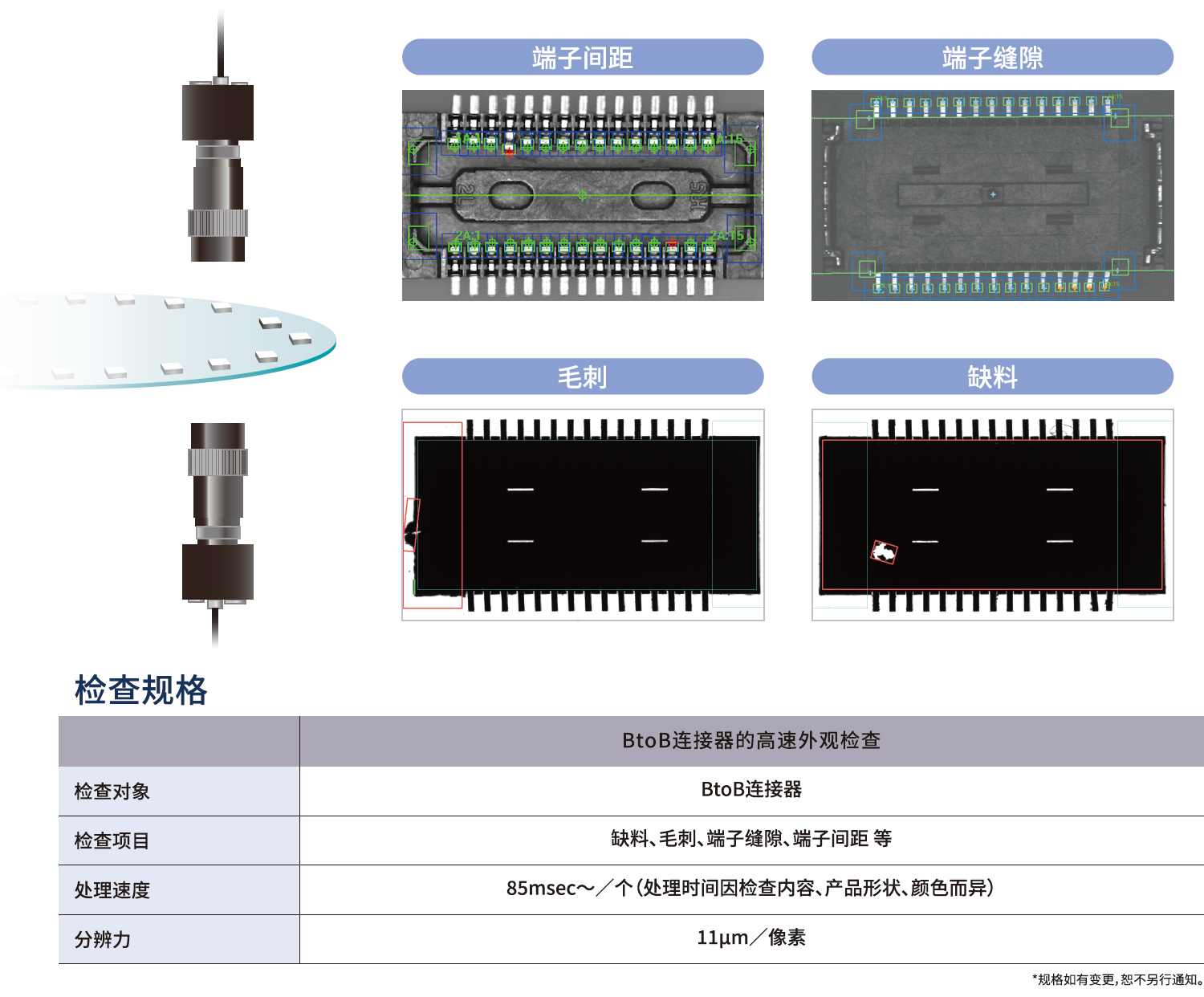 High speed visual inspection of BtoB connector High speed machining of 1000 pieces/minute! HSG appearance inspection of BtoB connector. Check material shortage, burr, terminal gap and terminal spacing. High speed inspection is completed by moving the camera.