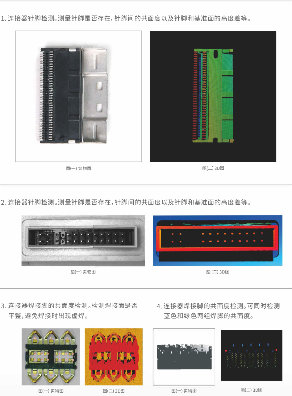 Detection advantages Accurate positioning: can accurately detect the height of small area pins One scan: can simultaneously detect the flatness of multiple surfaces High precision measurement: can simultaneously high-precision detect the height of metal and plastic materials